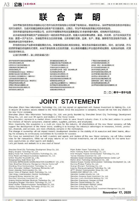 11月17日,多家企業在《深圳特區報》發布聯合聲明,深圳市智信新信息技術有限公司已與華為投資控股有限公司簽署了收購協議,完成對榮耀品牌相關業務資產的全面收購。出售后,華為不再持有新榮耀公司的任何股份。 深圳市智信新信息技術有限公司,由深圳市智慧城市科技發展集團與30余家榮耀代理商、經銷商共同投資設立,包括天音通信有限公司、蘇寧易購集團股份有限公司、北京松聯科技有限公司、深圳市順電實業有限公司、山東怡華通信科技有限公司、深圳冀順通投資有限公司、河南象之音健康科技有限公司、福建瑞聯優信科技有限公司、內蒙古英孚特通訊技術有限公司、哈爾濱金潭科技發展有限公司。